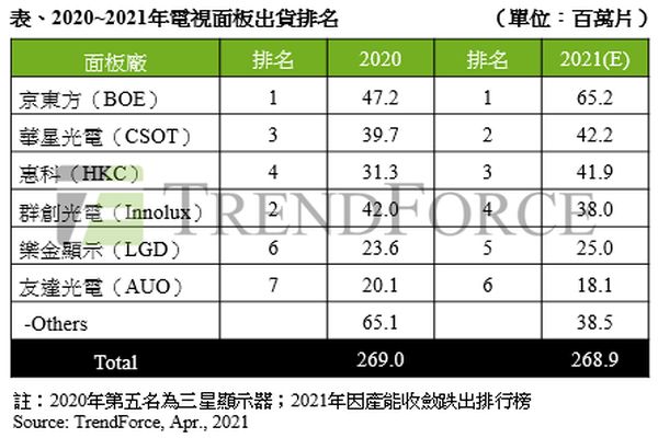 此外,在供不應求之際,產能正持續爬升的惠科(HKC)自然成為市場焦點,加上即將進入量產的長沙H5工廠,合計惠科已擁有四條8.6代產線,今年藉由產能提升,與一線品牌進一步的合作策略,預計惠科將首次進入電視面板出貨排行榜前三名,出貨量約4,191萬片,年增長33.7%。