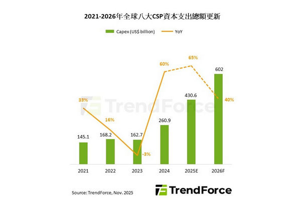 隨著北美雲端服務大廠 (CSP) 近日公布最新財報指引,TrendForce 將 2025 年全球八大主要 CSPs 資本支出 (CapEx) 總額年增率從原本的 61%,上修至 65%。預期 2026 年 CSPs 仍將維持積極的投資節奏,合計資本支出將進一步推升至 6,000 億美元以上,年增來到 40%,展現 AI 基礎建設的長期成長潛能。