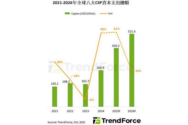 TrendForce 表示,2026 年在 GB / VR 等 AI 機櫃方案持續放量下,八大 CSP 的總資本支出有望再創新高,年增達 24%,來到 5,200 億美元以上。除此之外,支出結構已從能直接創造收益的設備,轉向 server、GPU 等短期資產,意味著鞏固中長期競爭力與市占率優先於改善短期獲利。