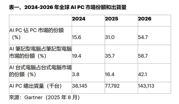 Gartner 分析師預測,2026 年 AI PC 出貨量將達到 1.43 億台,占整個 PC 市場的 55%(見表一),並且 AI PC 將在 2029 年成為常態。