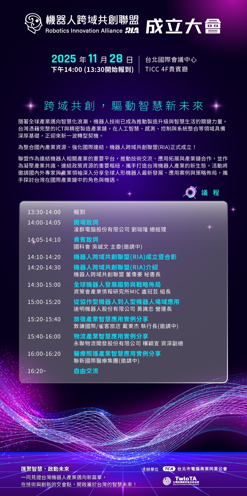 為促進跨域整合與場域落地應用,台北市電腦公會與台灣物聯網產業技術協會共同成立「機器人跨域共創聯盟」(Robotics Innovation Alliance, RIA)。聯盟以需求為核心,驅動技術創新與場域實證,鏈結交通、旅宿、餐飲、物流、醫療、巡檢等多元應用場景,結合機器人軟硬體解決方案供應商,透過「需求驅動 × 解方媒合 × 接軌國際」策略,從需求端出發,串聯上下游資源,構築完整的機器人產業生態鏈,推動技術落地與應用實現。