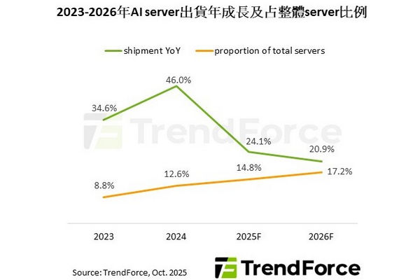 根據 TrendForce 最新 AI server 產業分析,2026 年因來自雲端服務業者 (CSP)、主權雲的需求持續穩健,對 GPU、ASIC 拉貨動能將有所提升,加上 AI 推理應用蓬勃發展,預計全球 AI server 出貨量將年增 20% 以上,占整體 server 比重上升至 17%。