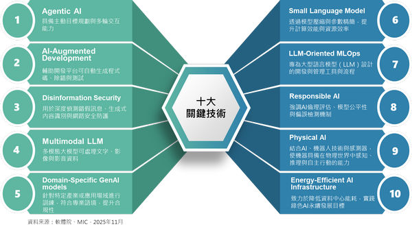 核心主軸,從 GenAI 的興起,擴展至結合實體互動的 Physical AI,持續全面滲透至百工百業。就技術而言,LLM 朝向長文化、領域化、多模多工、平台化、小型化及代理人化發展;在應用面,AI 加速企業流程自動化、商用 AI Agent 逐步落地、企業加速 AI 轉型。資策會發布 2026 年十大關鍵技術,包括實體 AI(Physical AI)、特定領域生成式 AI 模型(Domain-Specific GenAI)、負責任 AI (Responsible AI) 等。這十大技術將重塑產業結構,帶動醫療健康、能源效率、人機協作等新應用。