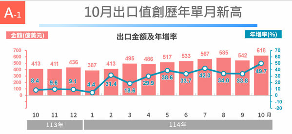 根據經濟部統計處 11 月 27 日發布的「當前經濟情勢概況」資料顯示,在全球經濟高度不確定的氛圍下,台灣十月出口表現亮眼,創下歷年單月新高,突破618億美元。