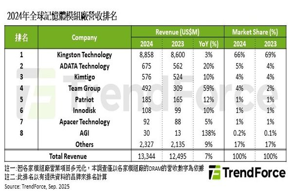 從 TrendForce 統計來看,2024 年全球前五大記憶體模組廠占整體營收 81%,前八大則囊括整體營收的 83%。龍頭廠商 Kingston(金士頓)的市占為 66%,穩居領先地位,然而營收成長幅度落後同業,主要反映 2024 年下半年消費市場需求轉弱。Kingston 持續堅守高端品牌定位,以確保獲利水準為優先的策略方向。