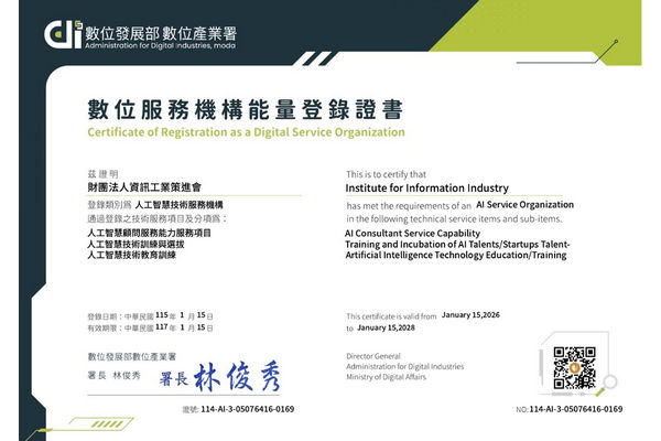 ▲財團法人資訊工業策進會通過數位發展部數位產業署「人工智慧技術服務機構能量登錄」,獲「人工智慧技術教育訓練」核定單位。