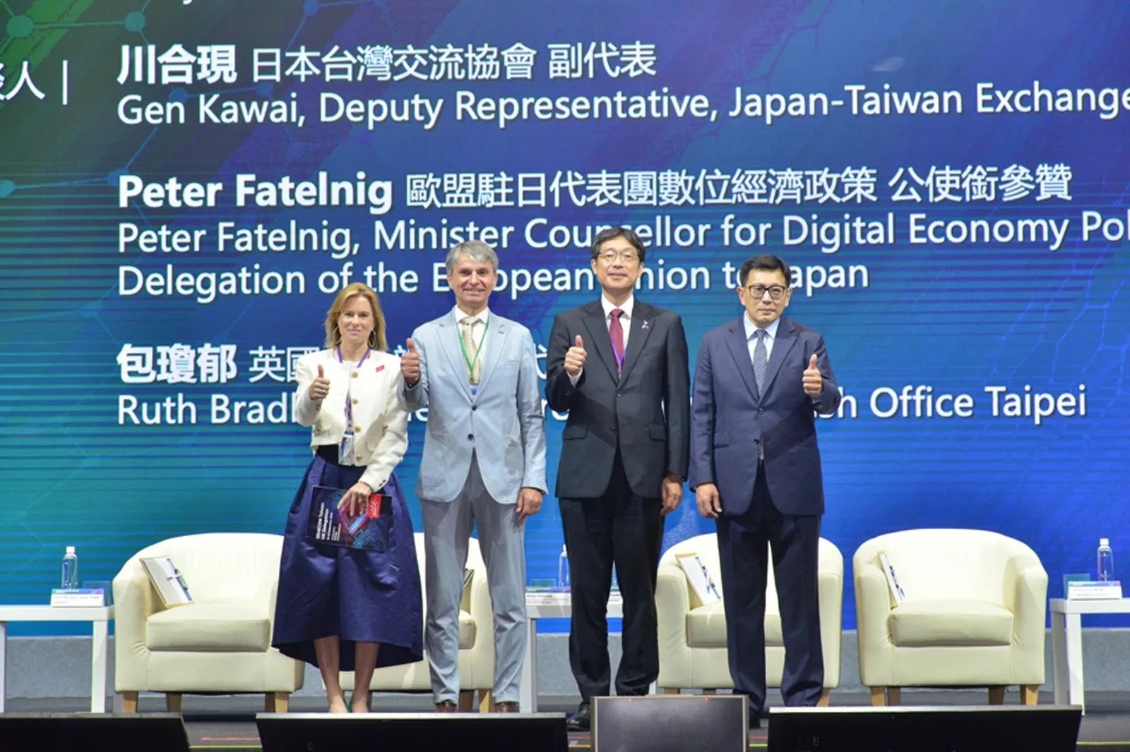 ▲開幕論壇邀集專家以「建構全球半導體網絡對話」為題,探討面對地緣政治與市場波動的影響,如何透過半導體國際戰略聯盟,強化供應鏈韌性。圖左起為英國在台辦事處代表包瓊郁、歐盟駐日代表團數位經濟政策公使銜參贊 Peter Fatelnig 、日本台灣交流協會副代表川合現、SEMI 國際半導體產業協會全球行銷長暨台灣區總裁曹世綸。