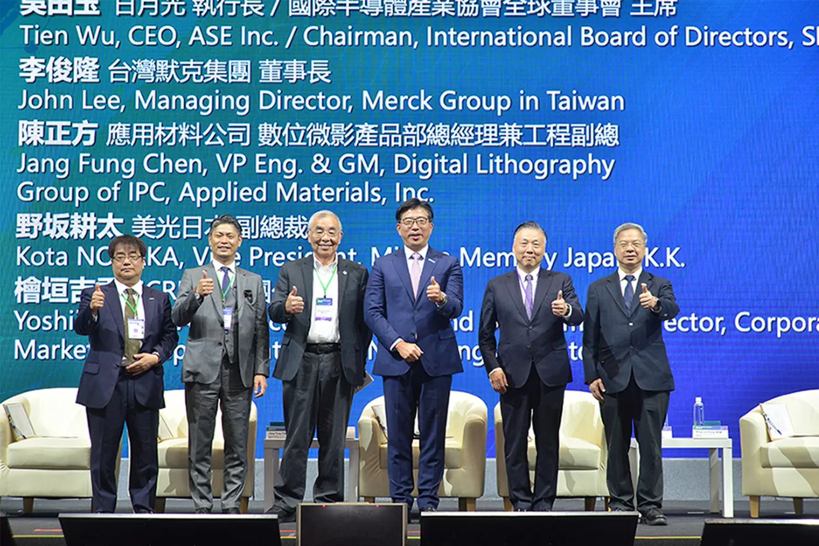 ▲第一場次座談以「強化可信任的跨國供應鏈夥伴關係」為題,聚焦於多元風險環境下,全球半導體產業如何透過區域互補來提升整體韌性。圖左起為 SCREEN 集團公司執行董事檜垣吉秀、美光日本副總裁野坂耕太、應用材料公司數位微影產品部總經理兼工程副總陳正方、台灣默克集團董事長李俊隆、日月光執行長暨 SEMI 國際半導體產業協會全球董事會主席吳田玉、經濟部部長龔明鑫。