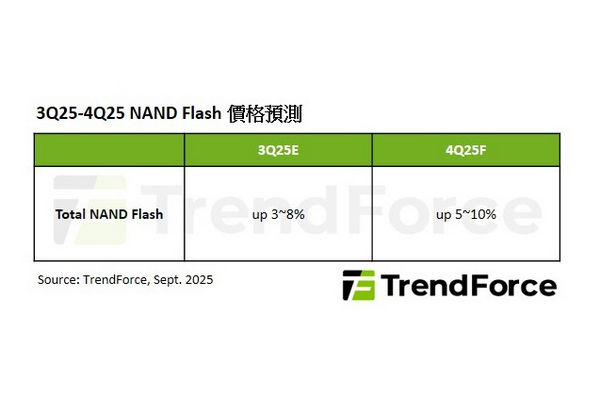 根據 TrendForce 觀察,由於消費市場需求提前在上半年被透支,下半年旺季未能如預期發揮效應,市場原本普遍預估 4Q25 價格將進入盤整。然而,HDD 供給短缺與過長交期,使 CSP 廠商將儲存需求快速轉向 QLC enterprise SSD,短期內急單大量湧入,造成市場明顯波動。同時,SanDisk 率先宣布調漲 10%,Micron 也因價格與產能配置考量暫停報價,使得供應端氛圍由保守轉為積極。在此外溢效應帶動下,預估 NAND Flash 第四季各類產品合約價將全面上漲,平均漲幅達 5-10%。